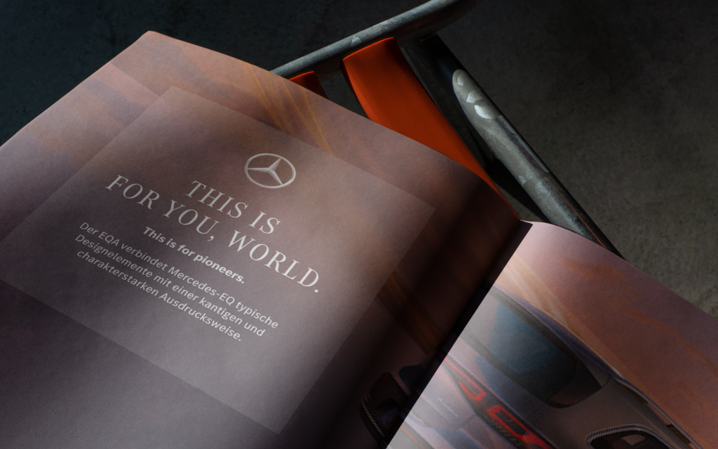 Our starting point: the new luxury strategy of Mercedes-Benz. Our hero that characterizes the new age of electromobility as part of the EQA campaign: the translucent, sculptural, light star. It absorbs the color of the background and is thus perfect for flexible use on all kind of images. A new typography and visual language, brighter colors and a less rigid layout system complete the look. They emphasize the spirit of optimism and the future-oriented openness of the sub-brand. At the same time, they are unmistakably Mercedes-Benz.