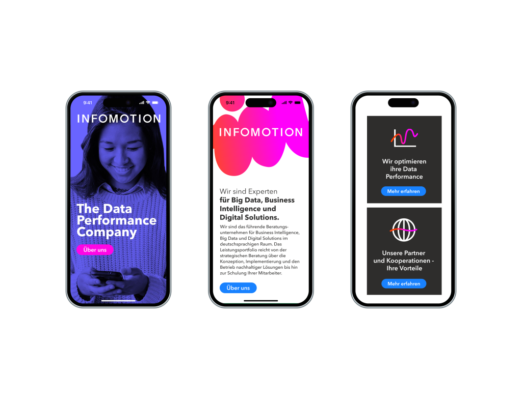 The times when data performance was seen as a nerdy niche topic are long gone. Consumers see it as a valuable consulting service with high economic impact. For INFOMOTION, we therefore developed a new identity that expresses industry leadership while at the same time showing emotions.